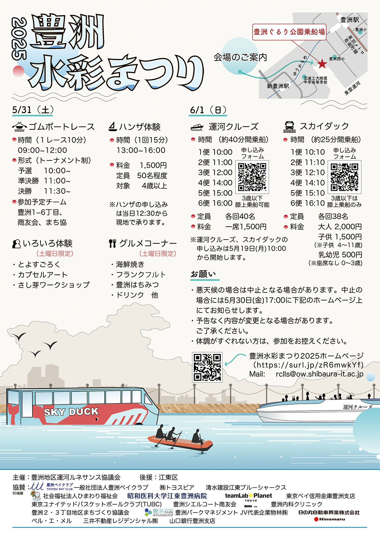05月31日(土)~06月01日(日)、豊洲ぐるり公園乗船場(東電堀)で、「豊洲水彩まつり2025」が開催されます。是非、ご参加ください。